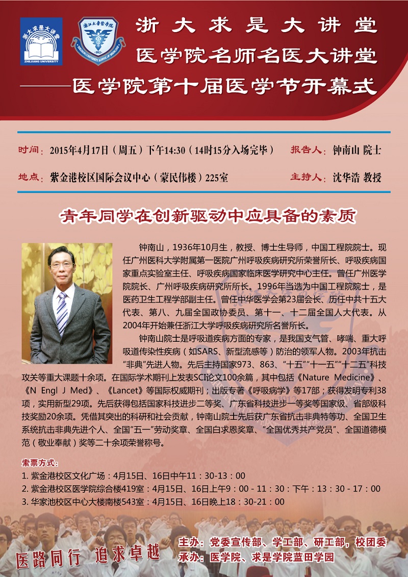 浙大求是大讲堂暨医学院名师名医大讲堂第八期--钟南山院士讲座的通知